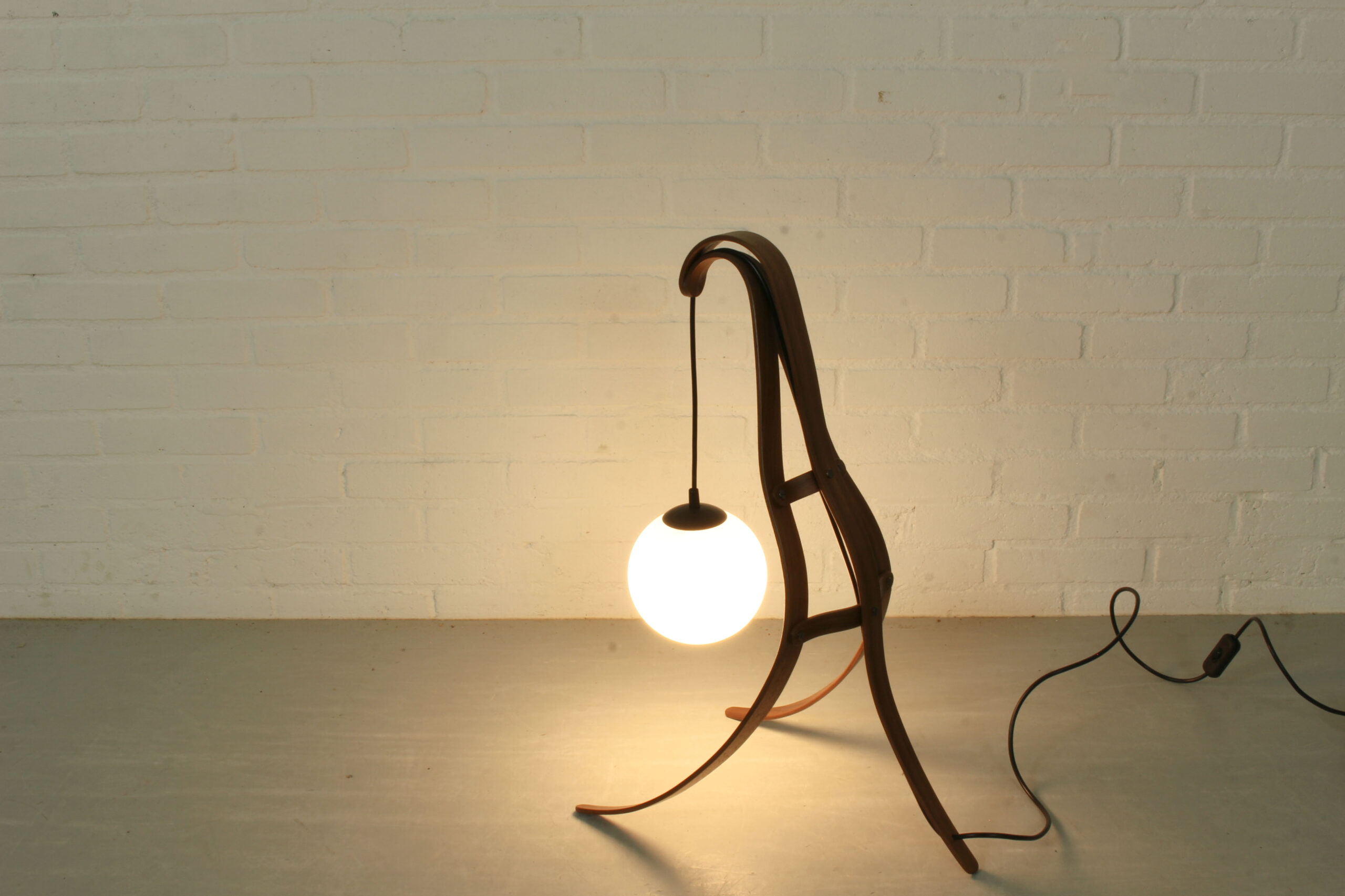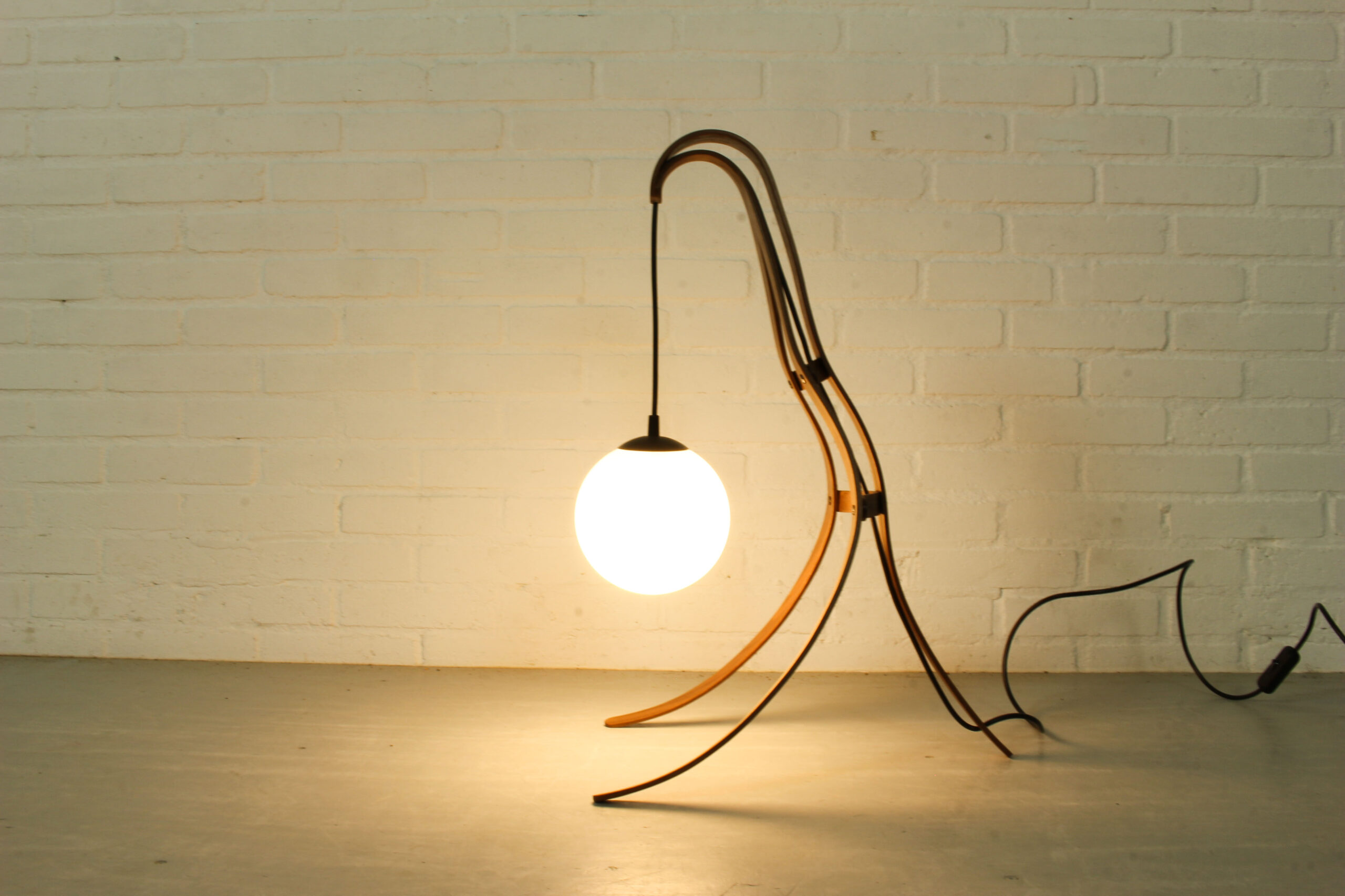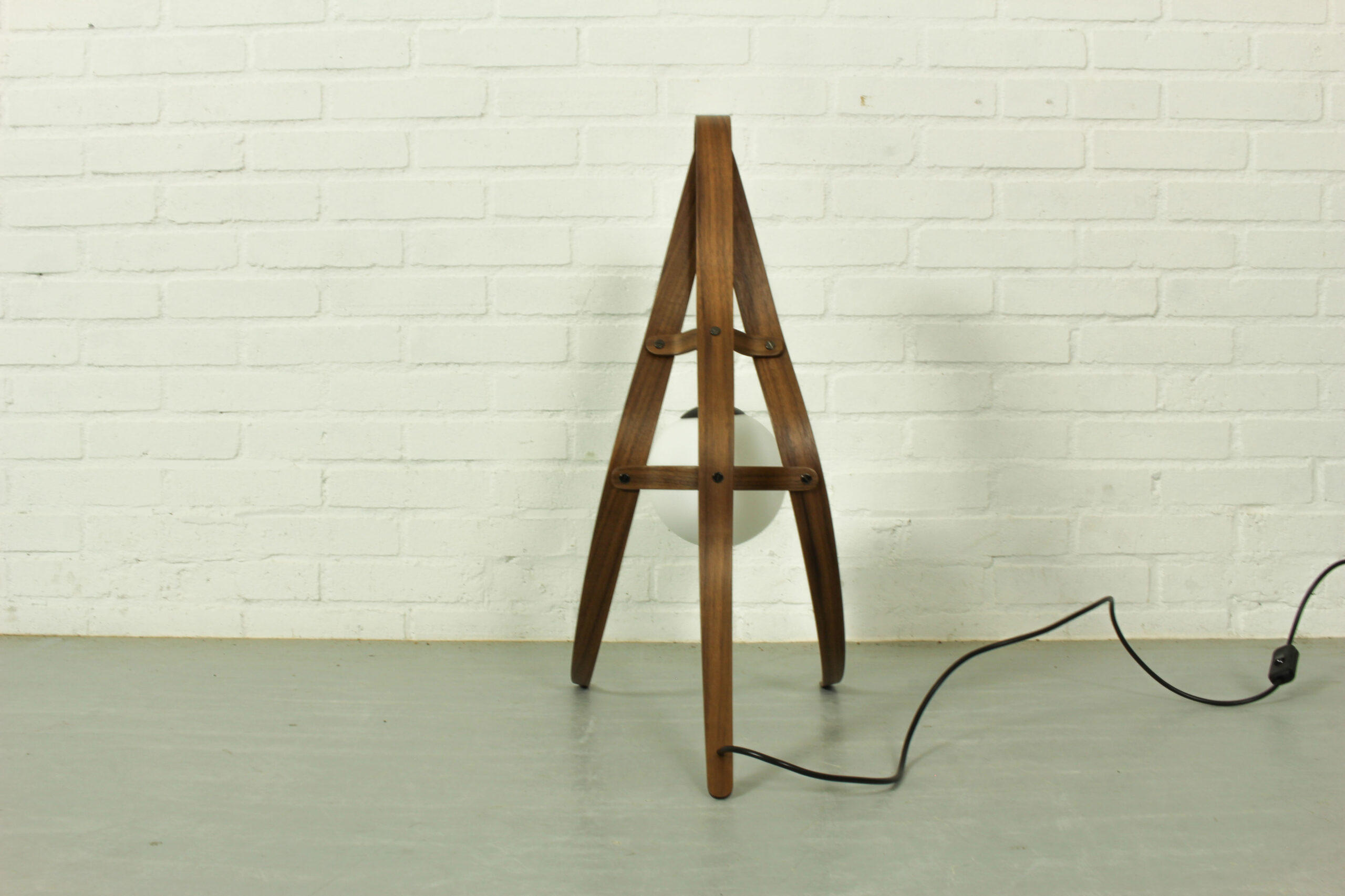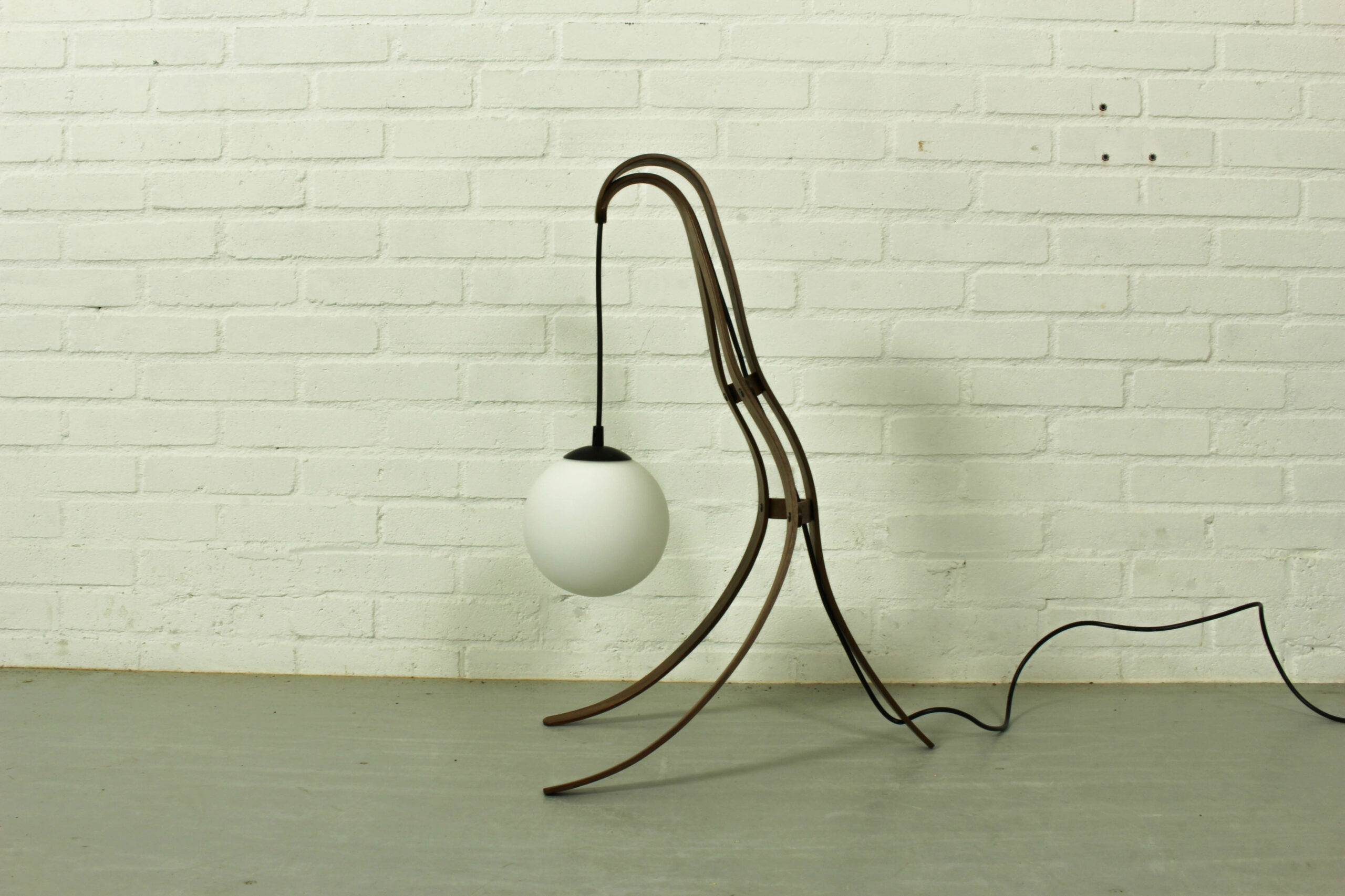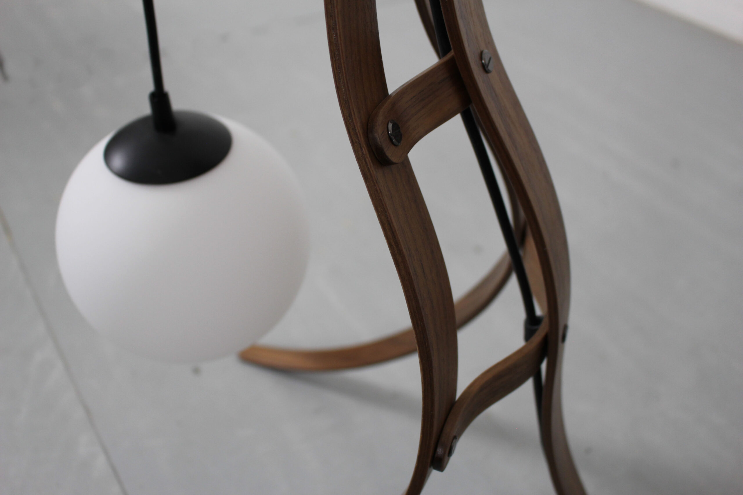 This one-of-a-kind floor lamp pairs a frosted glass globe with a handcrafted wooden arch of american nut, creating a graceful interplay between light and structure. The lamp’s organic silhouette and warm materials make it a true statement piece. A glowing vintage sphere suspended within a sculptural wooden arc – both functional and poetic. The base is handmade from richly grained wood, with elegant curves that cradle the light. Excellent condition; fully rewired and ready to use. Ideal for interiors that embrace natural materials, artistic forms, and timeless ambiance.