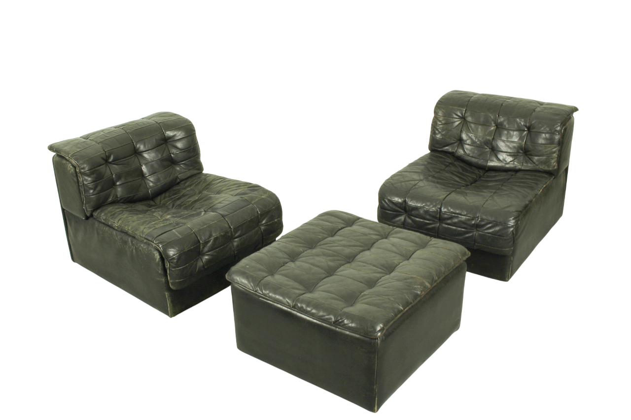 A vintage modular lounge set from the DS-11 series by De Sede, Switzerland, dating to the 1970s. This set includes two armless lounge chairs and a matching ottoman, all upholstered in original black leather with signature tufting and square paneling. Known for its luxurious comfort and craftsmanship, the DS-11 features a low-slung profile and generous cushioning, ideal for relaxed seating in modern interiors. The set is in vintage condition with visible wear and patina; structurally sound and fully functional. This iconic Swiss design is perfect for collectors of mid-century modern furniture or anyone seeking timeless comfort with a bold aesthetic.