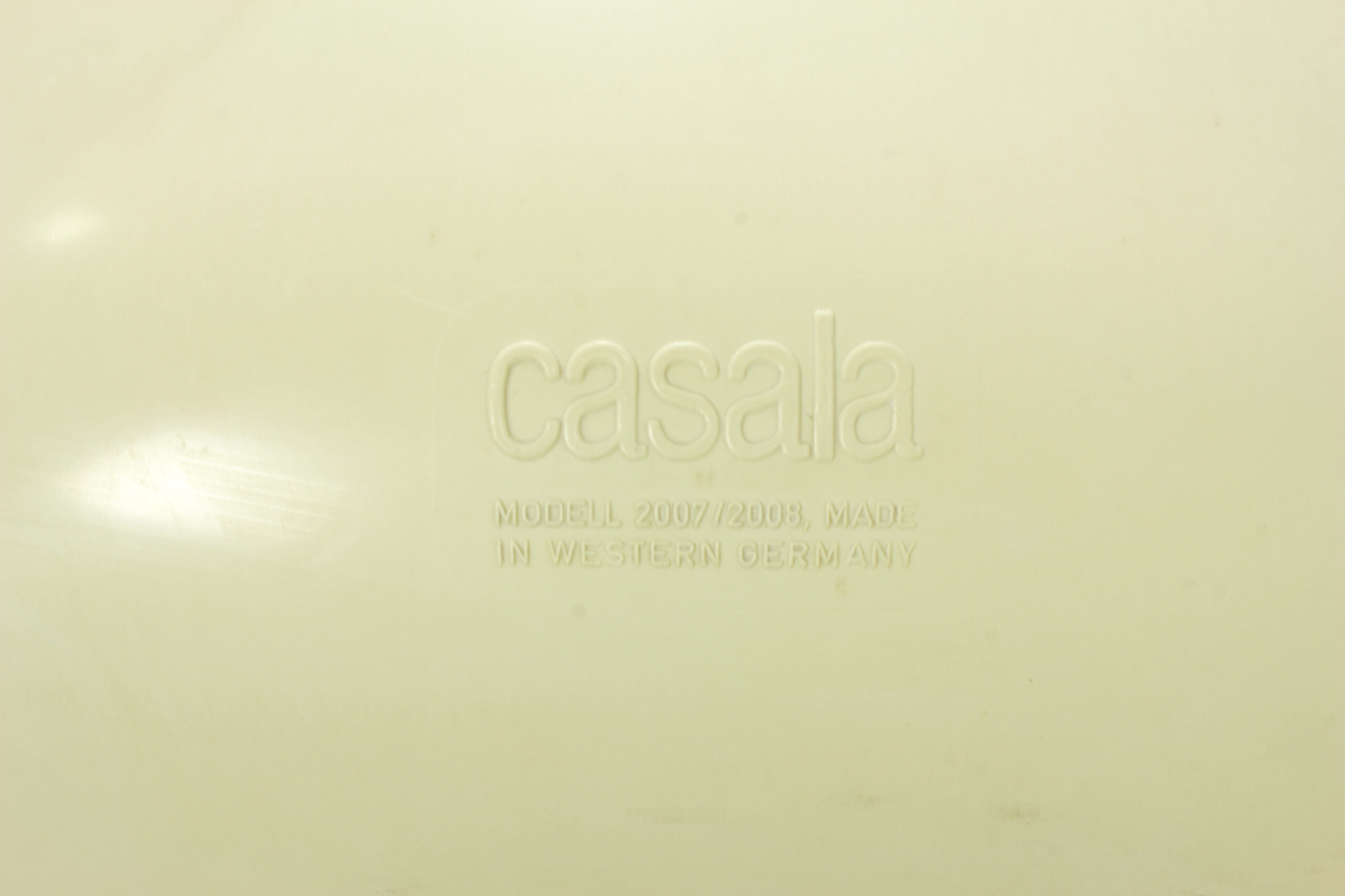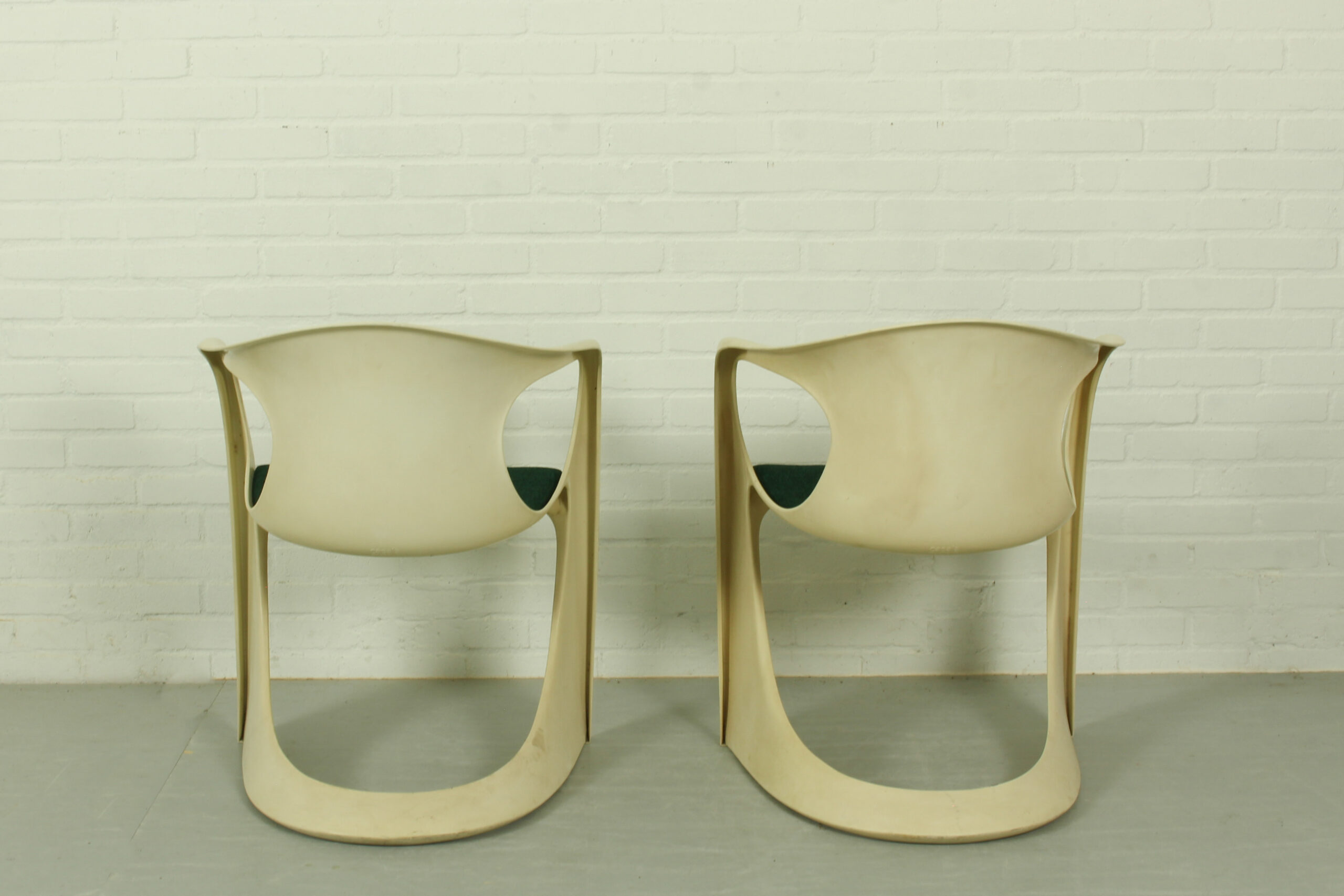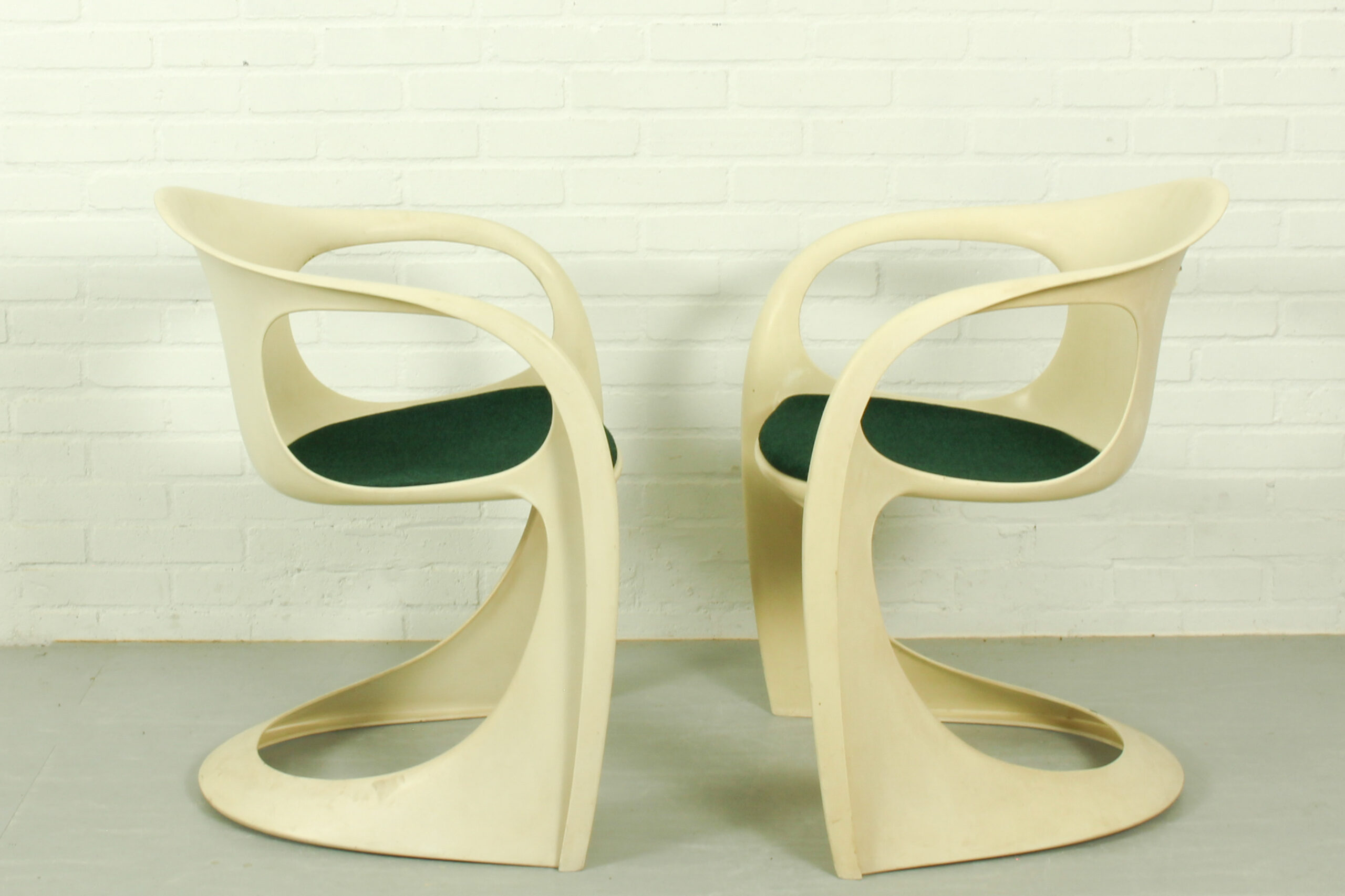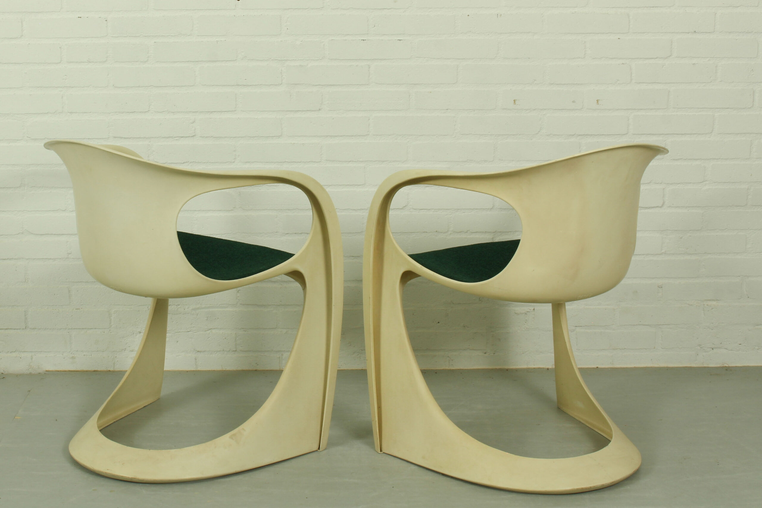 A sculptural set of two Casalino armchairs, designed by Alexander Begge for Casala, West Germany, in the early 1970s. These iconic chairs are celebrated examples of Space Age design, featuring fluid, organic lines and a cantilevered base that gives them a floating appearance. Crafted from molded fiberglass-reinforced plastic, each chair includes an upholstered seat cushion, adding comfort and contrast to the futuristic silhouette. These chairs are not only collectible design pieces but also practical for use in dining rooms, offices, or gallery spaces. Their timeless appeal and bold form make them perfect for lovers of retro-futurism and modernist interiors.