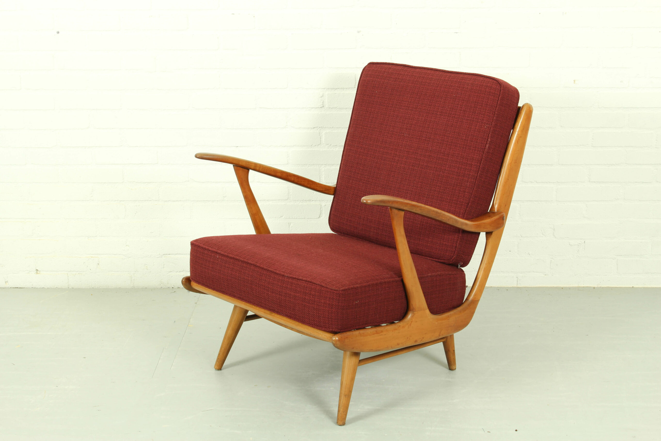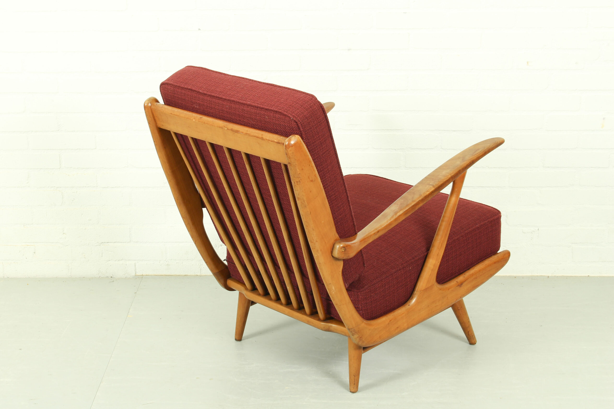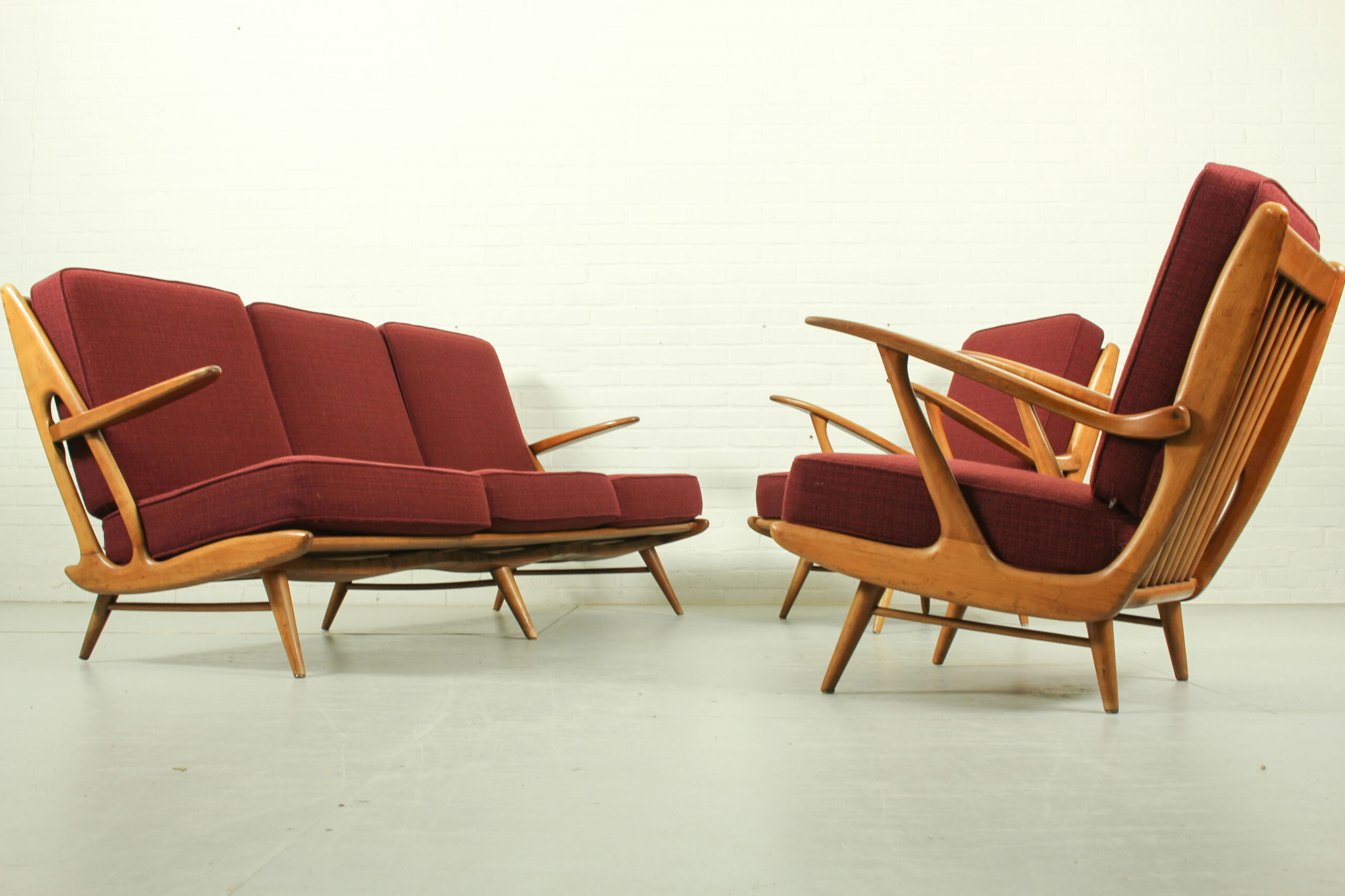 | Mid century modern organic carved sofa and 2 lounge chairs made of fruit wood, designed by B. Sprij / Spuij’s Vlaardingen – Holland. With original red fabric. In good condition with light signs of wear consistent with age and use.