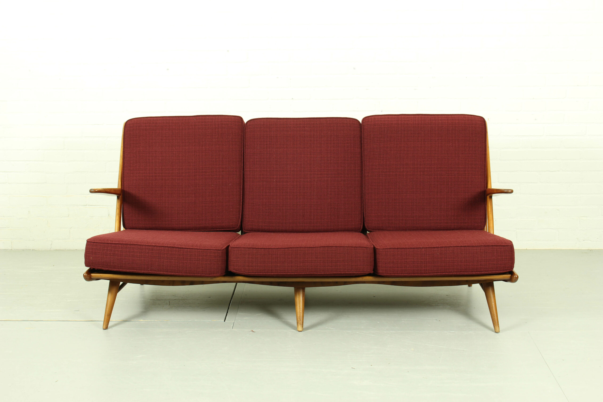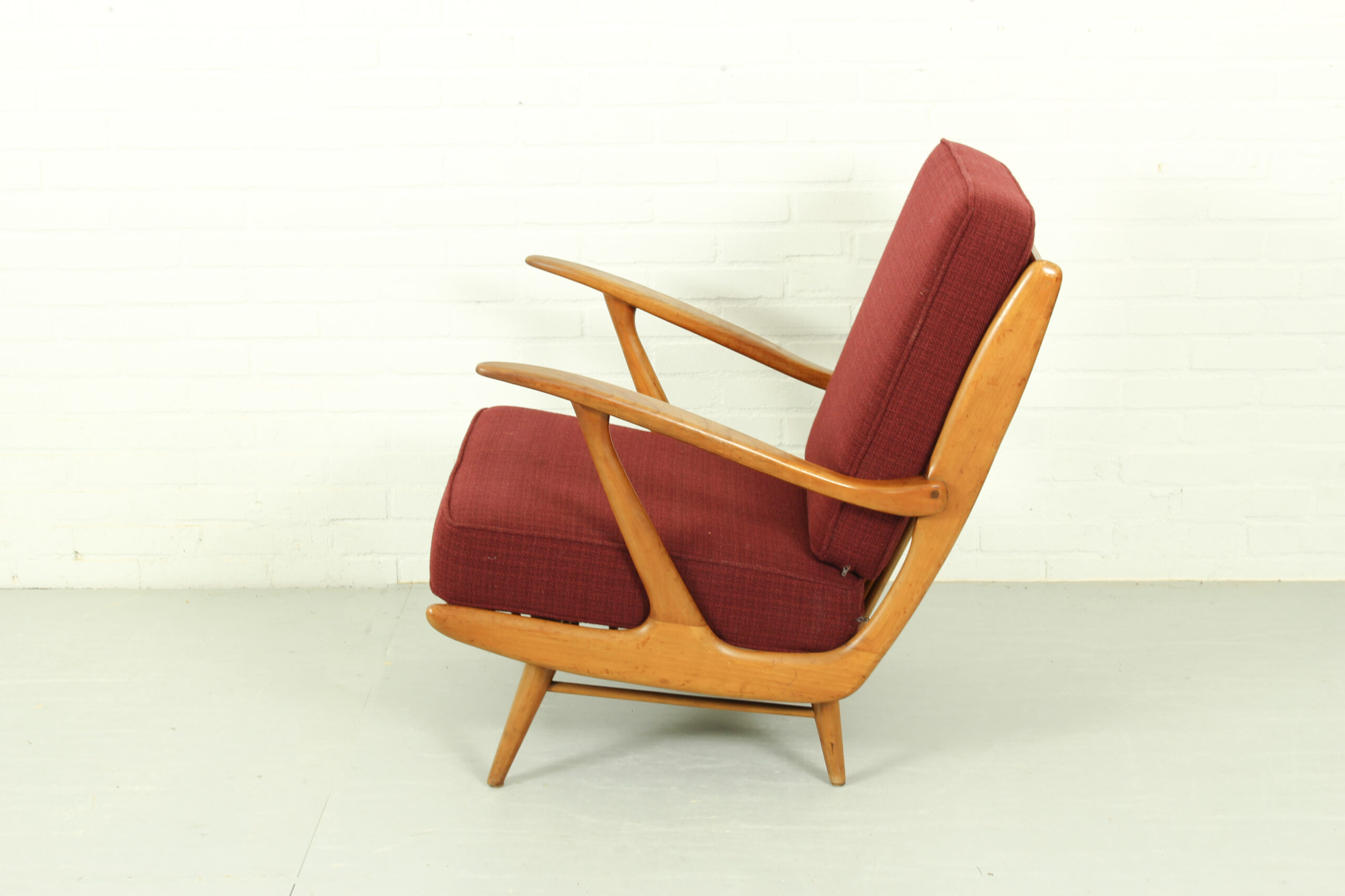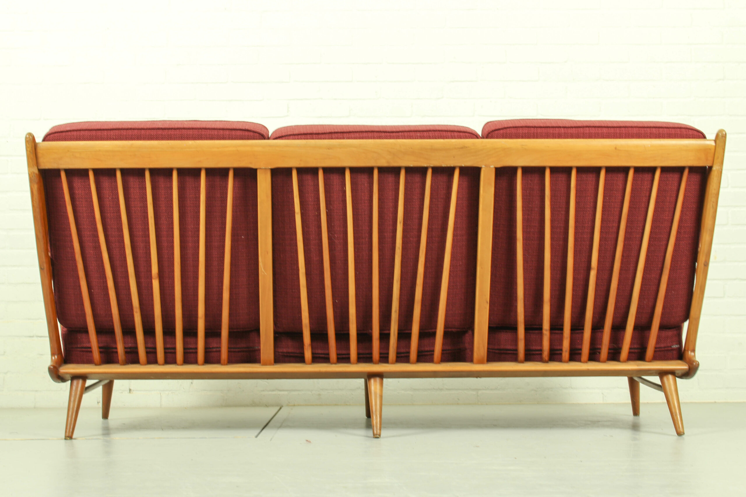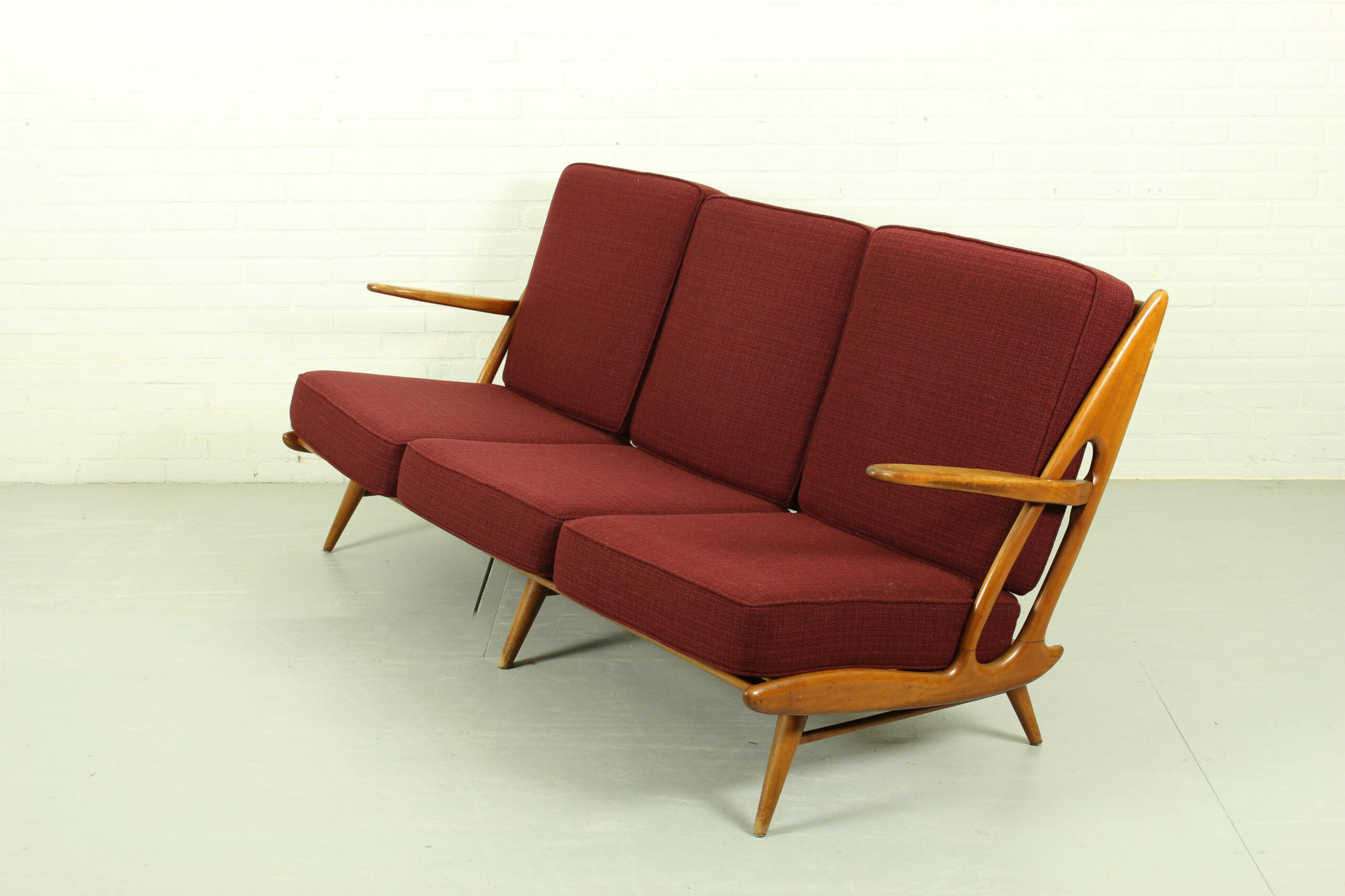 | Mid century modern organic carved sofa and 2 lounge chairs made of fruit wood, designed by B. Sprij / Spuij’s Vlaardingen – Holland. With original red fabric. In good condition with light signs of wear consistent with age and use.